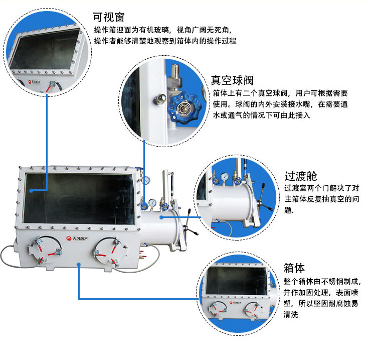 真空手套箱主要由主箱體和底座組成,如用戶有其它特殊要求,也可以根據需要進行設計或改造;箱體上有二到三個手套操作接口,操作箱迎面為有機玻璃,視角廣闊,操作者能夠清楚地觀察到箱體內的操作過程,使得操作過程較直觀地展現在操作者的眼前。箱體上有二個真空球閥,用戶可根據需要使用。球閥的內外安裝接水嘴,在需要通水或通氣的情況下可由此接入。箱體內裝了照明燈泡和多孔插座。