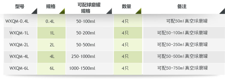 表一:輕型臥式行星式球磨機配罐參考